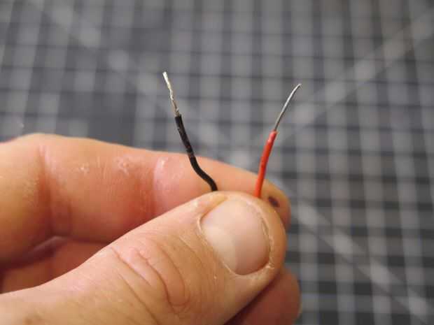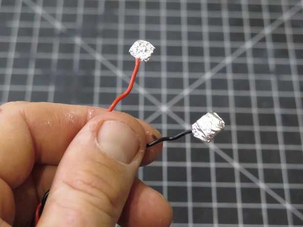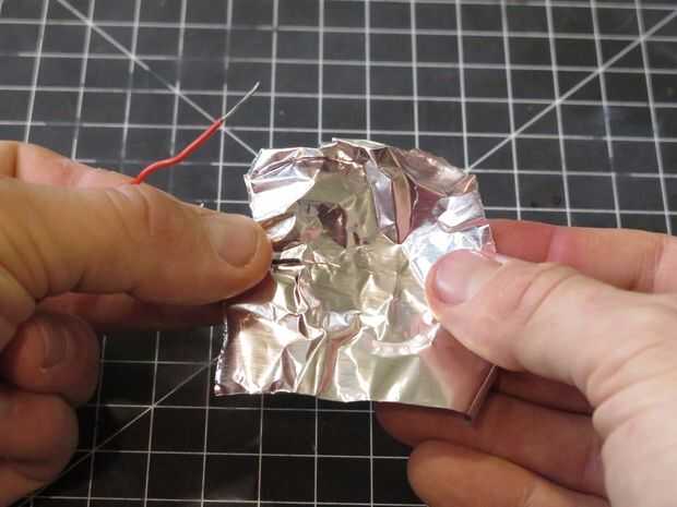 Empezar por pelar los extremos del cable sobre una pulgada o tan. Use un papel de aluminio, doblar alrededor de cada cable y les aplasta para que los dos extremos de contacto son como panqueques de metal. Esto nos dará una mayor superficie en contacto con nuestro paquete de baterías.