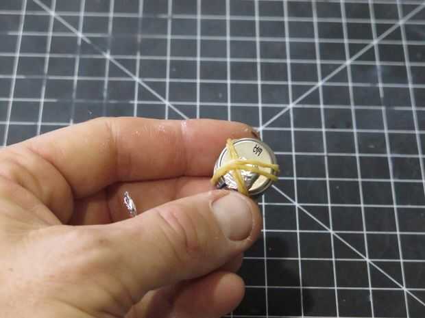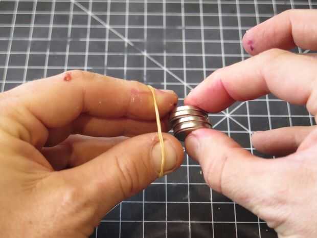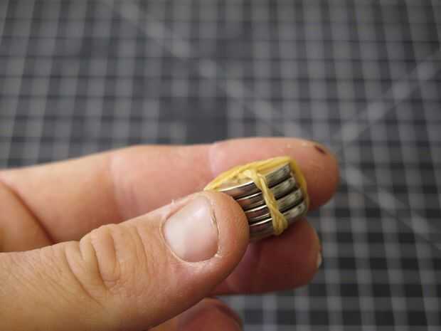 Comenzar con una serie de 1.5V baterías de disco y ponerlos juntos en la misma orientación. Usted puede goma banda de juntas y cinta de los lados, también. NO CALIENTE PEGAMENTO.