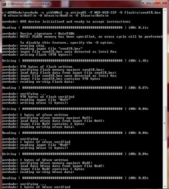 El programador verifica la firma del dispositivo, el bits del fusible y escribe el programa en la memoria flash del controlador en cuestión de segundos. Ahora el ATtiny85 está listo para enviar la señal de infrarrojos. Conectar un IR entre los pines 7 y 8 a través de un resistor de 100 ohm y ver que envíe una señal específica de IR. Usted no será capaz de ver las señales de IR a través de ojos desnudos. Uso teléfono cámara!