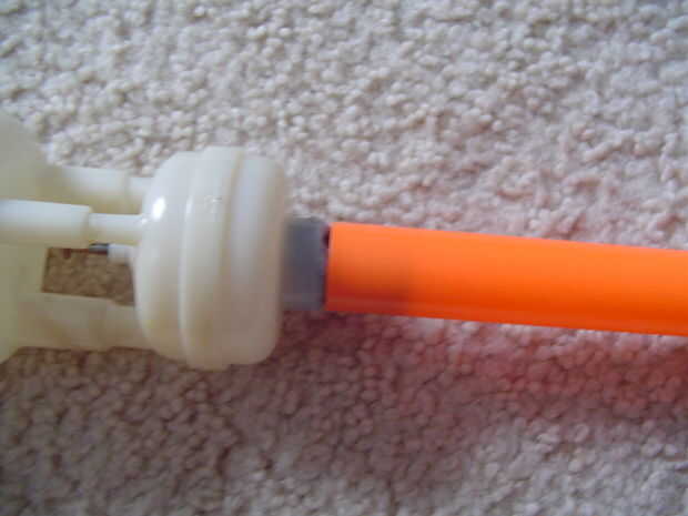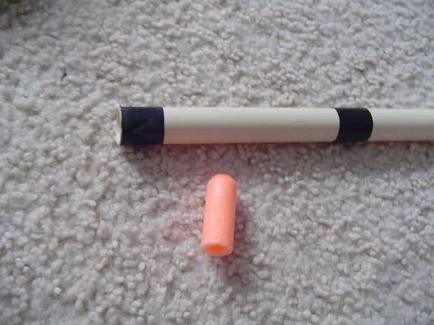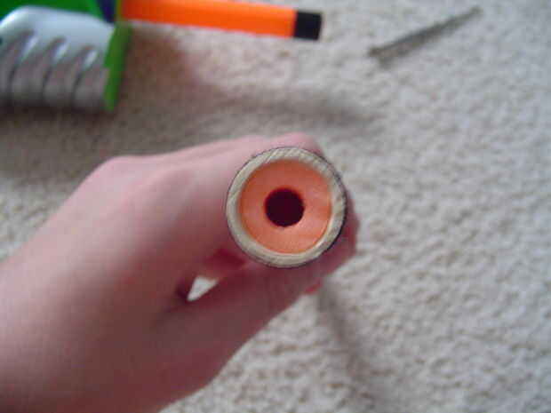 Corte don barril negro stock por lo que hay alrededor de un centímetro a la izquierda. Luego, la arena en el exterior para que la extensión del barril naranja se ajusta en perfectamente pero no para colocar o se puede romper. Si también se pierde para ti, pegarlo en y pegamento o cinta adhesiva, pero que haría este mod semi irreversible. Corte su extensión barril naranja a aproximadamente 5 pulgadas y pegar en. Ahora, el cpvc y cortarlo bien a tus obras de 9-10 pulgadas de longitud cañón deseada. Envuelva la cinta aislante alrededor del extremo y donde el cañón viene hasta para un sello hermético.
