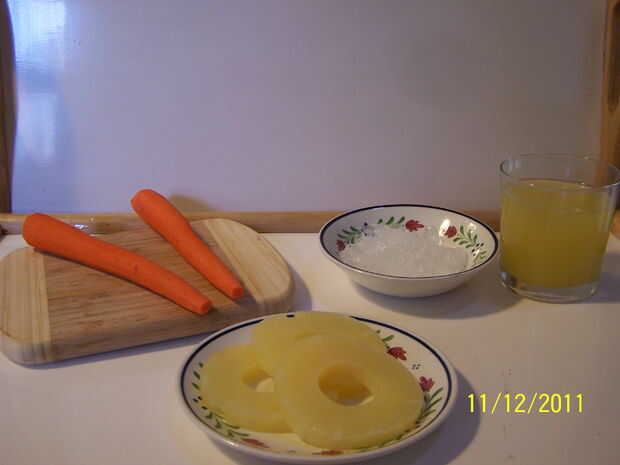 ingredientes: 2 zanahorias peladas 3 rebanadas de piña enlatada 3/4 tazas jugo de piña (funciona mejor si hace frío) 5-6 cubitos de hielo, machacado rebanada de la manzana (para decorar)