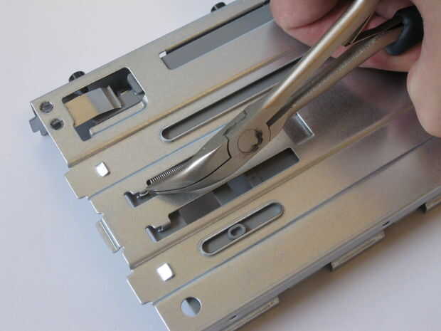 Voltee la bahía y retire el muelle. El inserto plástico debe deslizarse por la parte frontal pulsando las lengüetas de plástico. Requiere un poco de esfuerzo.