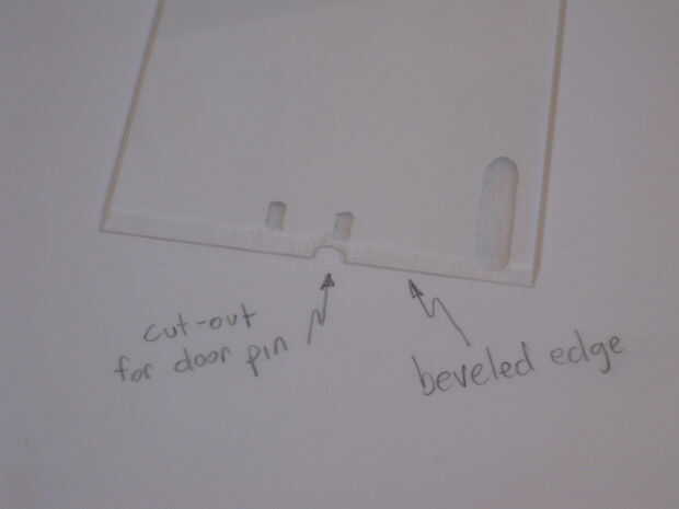 Entonces había biselado del borde para que el Zune se deslice en su lugar. He probado la base en la jaula con la parte superior en lugar para asegurarse de que la puerta se abra y se cierre. Resulta que hay un pin en la puerta. Tuve que hacer un recorte para el pin pasar.