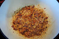 En la misma olla sobre fuego medio-alto, cocine el tocino, rompiendo en pedazos pequeños. Retirar y reservar, dejando 2 cucharadas de grasa de tocino en la olla (este se utilizará luego para saltear las verduras).