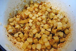 Cocinar hasta que la cebolla comience a translúcido y patatas se han suavizado un poco.