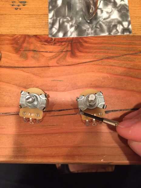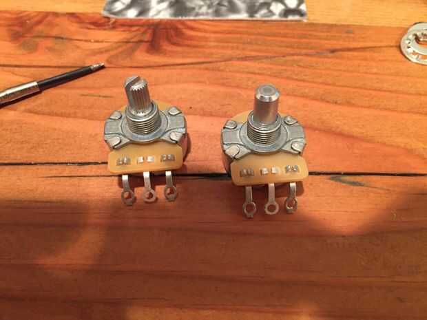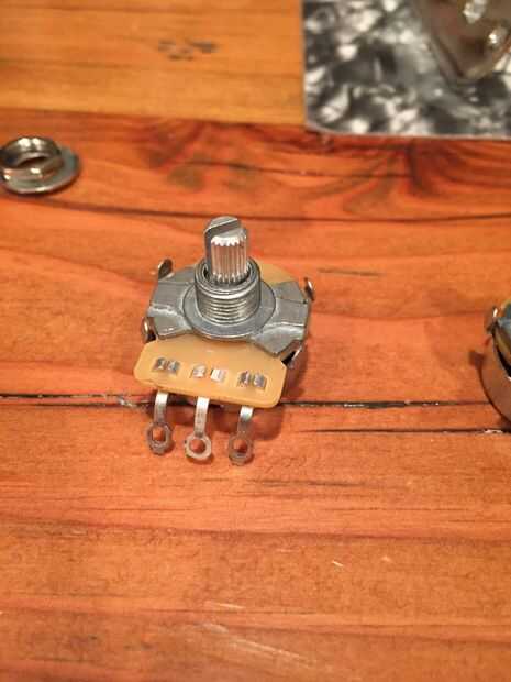 Ser zurdo, opté por usar un 250 k inversa forma cónica logarítmica/audio taper olla. El único problema con esto es que la CTS solo hace estos cacharros con un split, estriado del eje. Esto no es tradicional para una telecaster, por lo tanto tuve que modificar el pote a mi gusto. Se trata de apalancamiento cuidadosamente las pestañas que sujetan el bote en la carcasa y cambiar el eje de un pote con el eje de otro. Ahora tengo una 250 olla audio inversa de k con un eje sólido. Miré a pedir estos directamente de CTS pero el pedido mínimo era algo así como 5.000 macetas. No podía usarlos de toda la vida y no estoy en el negocio de revender macetas de manos izquierdas.