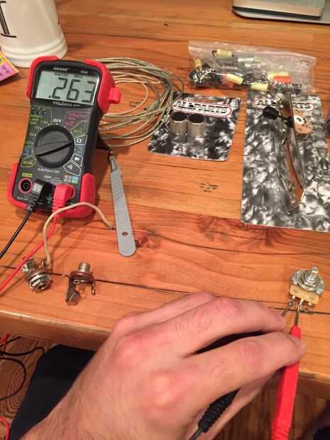 He elegido usar potes de 250k de marca CTS en esta placa de control. BOURNS y ollas alfa son bien sustitutos pero no durará tanto. Medir la resistencia de cada maceta que utilizar para asegurar que el valor es donde quiero estar. La resistencia del pote de volumen no es tan importante como la resistencia del pote de tono. Dicho esto, todavía quiero disparar tan cerca de las especificaciones enumeradas como sea posible. De las macetas que tenían en mano, el pote de volumen surgió 263 y el tono en 271. Mientras que estoy en ello, verificar la forma cónica de la olla como esto puede variar un poco así.