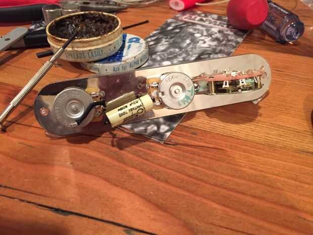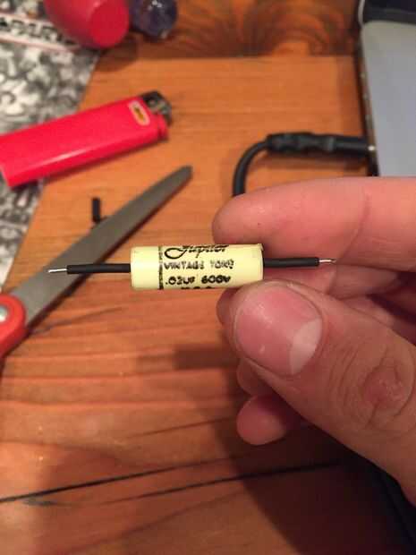 El valor de la tapa tradicional en una guitarra de estilo telecaster es .047uf. Para mí, este valor es demasiado grande y resulta en un tono que es unusably oscuro cuando la perilla de tono es todo lo que salió. Para esta build, he optado por un condensador de Júpiter.022. Estos condensadores son similares en tono a las tapas vintage encontradas amplificadores de fender tweed. Verifique el valor de los condensadores de que instalar, incluso en guitarras, para asegurarse de que son tan cerca de especificación posible. También recomendaría instalar shrink cabeza sobre los cables del condensador. No quiero los cables del condensador que aplastado contra la parte trasera de un bote, una vez instalado en la guitarra. Esto podría causar un corto circuito y no hay señal para pasar a través.